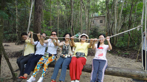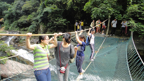 没有参加漂流的同事则置身于风景优美的原生态体验游览区,沿途参与了与众不同的原始体验项目,如:神奇的满归泉、许愿树、机关阵、千秋林、闯九关、空中走廊、抓土鸡蛋等项目。在闯九关中大家你拉我我扶你,过了一关又一关,玩得不亦悦乎。沿路玩下来还能“偶遇”在漂流的同事,赶紧“咔嚓”一声为其留下美好瞬间。