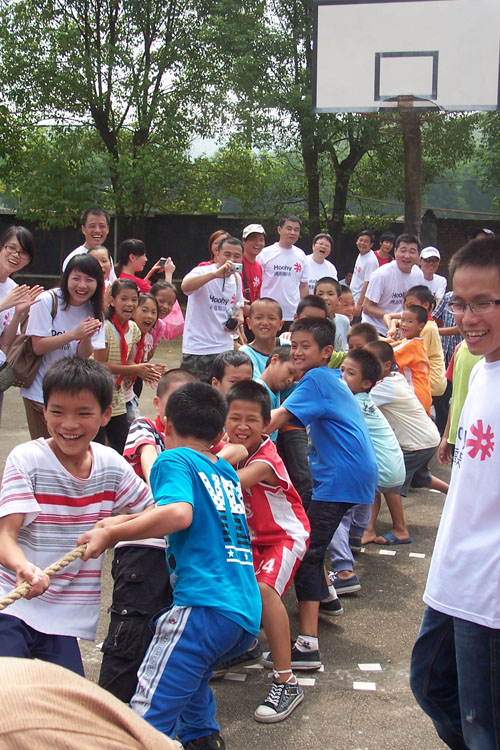 当天,我们还与孩子们玩起了互动游戏,有激烈的拔河,有蒙上眼睛的劈球游戏,有需要耐心的钓鱼游戏;有踢足球、有打篮球、有踢毽子等等。大人小孩都玩在一起,操场上尽是欢声笑语和活跃身影。孩子们的灿烂的笑容唤起了我们关于童年的记忆,而他们能灿烂地微笑,让我们感到到无比欣慰!