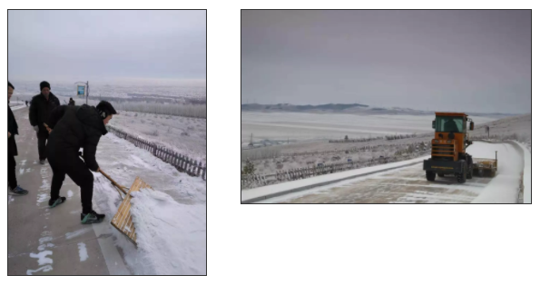 因为积雪的原因,我们第二批的小伙伴走的是另外一条上山的路,有工作人员已经为我们扫出了一条道路,还有南方的小伙伴要自己体验一下扫雪的。