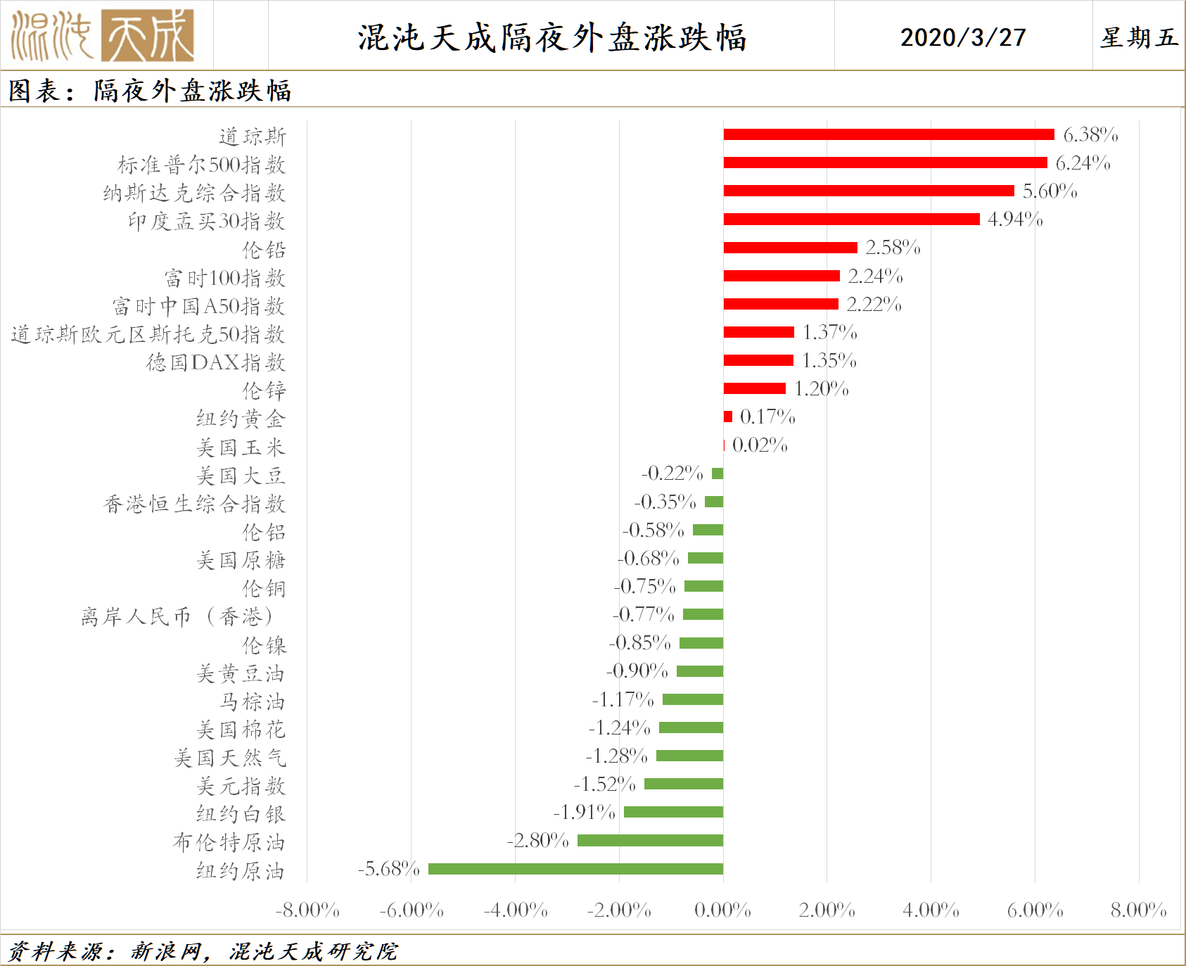 美股尾盘急拉,道指最终收涨逾1300点,创1931年10月以来最佳连续3日涨幅。道指三日累涨近4000点,涨幅高达21.3%。纳指涨5.6%,标普500指数涨6.24%。上证指数收盘跌0.6%,两市成交额6425亿元,创阶段新低。北向资金净流出13.57亿元。国外疫情发酵、湖北解封,市场在走做多国内需求、做空国外需求的逻辑。流动性危机缓解和各国政策发力,外围市场迎来反弹窗口。但是A股一直相对坚挺,所以反弹空间有限。国内方面,我们认为市场对于宽松的预期可能过高,面临预期差的调整。上周利率没有降,二月份的经济数据挖坑,现在市场要直视疫情对经济造成的实质影响而不是沉浸在疫情受控的乐观中。此外从盈利来看,内外需特别是外需的走弱将使市场下调企业的盈利预测,估值仍有回调空间。