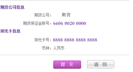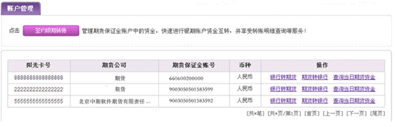 6.点击账户管理菜单,若已签约完毕,账户列表会展示阳光卡号、期货公司、期货保证金账号、币种和操作功能(包括银行转期货、期货转银行、查询当日期货资金)