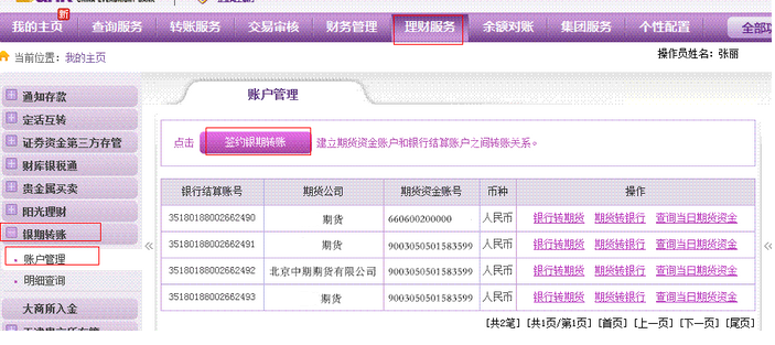 2.进入投资理财下的银期转账,进入银期转账下的账户管理