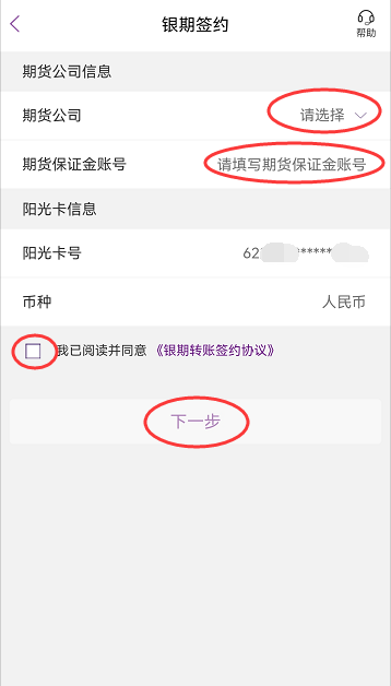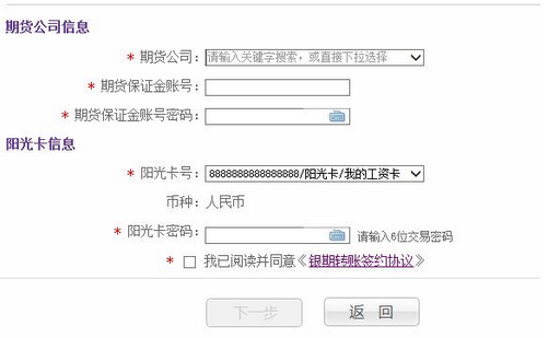 4.客户点击下拉菜单,选择所需签约期货公司,填写“期货保证金账号”和“期货保证金账号密码”并输入“阳光卡密码”,点击并阅读《银期转账签约协议》,打“√”,点击“下一步”
