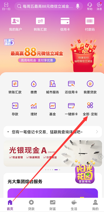 1.手机登录光大银行账号,点击下方首页→全部·定制