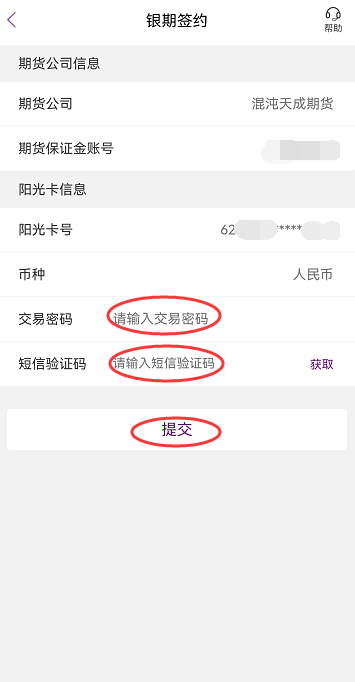 5.交易密码输入期货资金密码,点获取短信验证码,点击“提交”