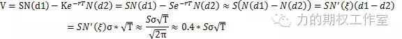 其中,第二个等号是因为期权是平值的,第三个等号运用了著名的拉格朗日中值定理,第一个约等号运用了在无风险利率r接近于0时,exp(-rT)约等于1的事实,最后一个约等号运用了0.4=1/sqrt(2*pi)。