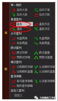 操作上,我们还是进入“期权策略交易”的界面,选择左侧策略栏里的“垂直套利”里的“温涨”或者“温跌”,见下图红色圆框标识之处。