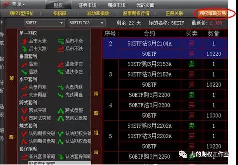 操作上,交易客户端很友善地为你想到了这一点(我们以汇点、50ETF期权举例),登录期权交易客户端后,首先在上方菜单里选择期权策略交易(下图红色圆框标注)。