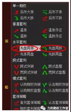 操作上,我们还是进入“期权策略交易”的界面,选择左侧策略栏里的“水平套利”的“先盘再涨”或者“先盘再跌”,见下图红色圆框标识之处。