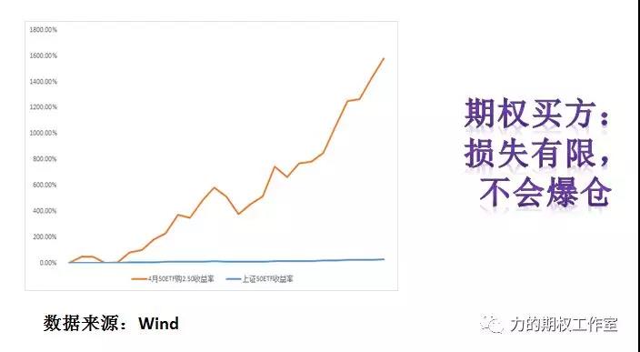 从上面这张净值图可以看到,期权和50ETF指数放在一张图里比较的话,50指数的收益率几乎是躺在地板上的。50指数上涨28%的这段时期内,期权上涨了1583%,涨幅远远超过50指数。期权既可以做买方又可以做卖方,做买方是不会爆仓的,相当于投保人,只有权利没有义务。
