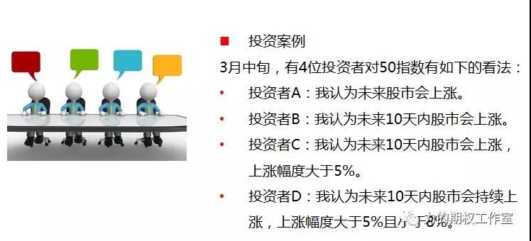 有些朋友喜欢打麻将或者打扑克。比如四个人围成一桌麻将,四个人对未来50指数有这样的看法:投资者A认为未来50指数会上涨,这个人水平高不高呢?我认为他的水平不高。因为50指数未来上涨的可能性有50%,这句话大家都会说,就像抛硬币的正反面一样;投资者B认为50指数十天内会上涨,他比投资者A多了一个时间上的预期;