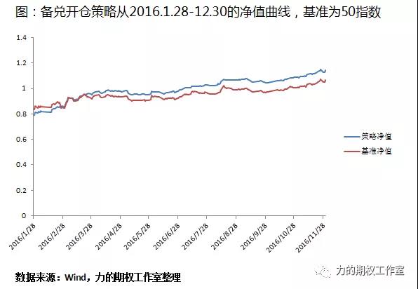 备兑开仓策略到底有多好,在慢牛格局里到底有多稳定呢?我做了一个比较简单的回测,大家看上图所示的曲线。2016年第三轮股灾结束后,如果每个月都进行这种备兑开仓的策略也就是持房出租的操作,年化收益大概超过20%。只要每个月拿着10万份甚至100万份ETF卖出对应张数的认购期权,持续从2016年1月28号做到2016年的12月30号,就可以获得20%左右的收益。在这个慢牛格局当中,备兑开仓不仅收益比较高,从图中的蓝色曲线可以看到,它的回撤和波动也不大,并且能够超越红色这根基准曲线(也就是50指数),在这个11个月中,备兑开仓策略完全跑赢大盘。