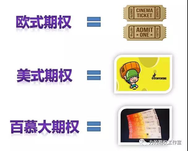 又如,在学习期权分类时,会听说欧式期权、美式期权、百慕大期权的概念,于是你会发现欧式期权好比电影票,只能到期当天行权(8月8日的电影票是不能在8月7日提前入场观看的),美式期权就像月饼票,它可以在到期前任一交易日行权(9月1日公司发的月饼票可以在中秋节前任何一天去提货),而百慕大期权就像中超球赛套票(每周末可以进场看球,一系列时间点可以行权,其他时候不能行权)。