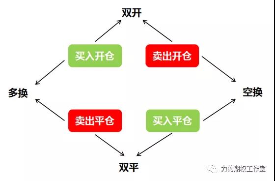 在期权交易里,基本的指令有四种:买入开仓、卖出开仓、卖出平仓、买入平仓。由于期权的成交一定是买方与卖方的成交,因此买入开仓可以和卖出开仓成交,也能和卖出平仓成交,同样地卖出开仓可以和买入开仓成交,也可以和买入平仓成交,所以这四种基本的期权交易指令就可以先行排列组合出下面四种成交的性质。分别是: