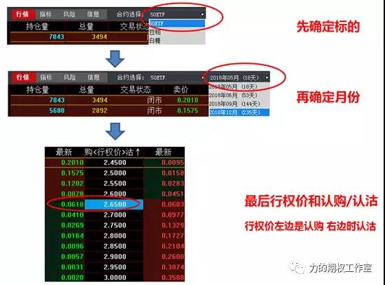 在“T型报价”的显示界面下,查找具体合约就会显得非常方便。一个期权合约的四要素是标的、到期月份、行权价、认购还是认沽。具体寻找时,我们始终遵循四部曲:先选择合约标的,再选择到期月份,然后查找行权价格,最后确定认购还是认沽。以“50ETF购5月2650”为例,下图展示了查找到该合约的全流程。