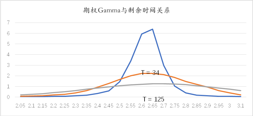 图1为是Gamma与剩余时间关系,随着到期日的临近(T越小),平值期权的Gamma值会变得越来越大,而离平值越远的实值与虚值期权的Gamma值则越小。整个分布呈现尖峰状态。而这种离到期日非常近的期权合约,Gamma值就会达到近乎妖怪般的程度。也就是说标的物价格的快速变动,会使虚值期权向平值快速变动,从而让期权合约价格呈现爆发式增长。而平值期权向实值期权变化的过程中,Gamma值将逐步变小,最终实值期权的价格变化将与标的物价格变化一致。简而言之,只有处于深度虚值的期权才能拥有高爆发的可能,当处于平值向实值变化的过程中,并不会产生具有巨大的涨幅。在2019年2月25日开盘时,50ETF价格为2.64,这份2月到期行权价为2.8的认购期权,行权价离标的物价格距离非常远,也就是说除非到期日时,标的物价格超过2.8,否则该合约没有行权价值,也就是需要50ETF在未来2天累计涨幅比2.64的开盘价超过6%。短短2天内,涨幅超过6%,似乎在当下的行情中并不困难,但是实际上却并非易事。