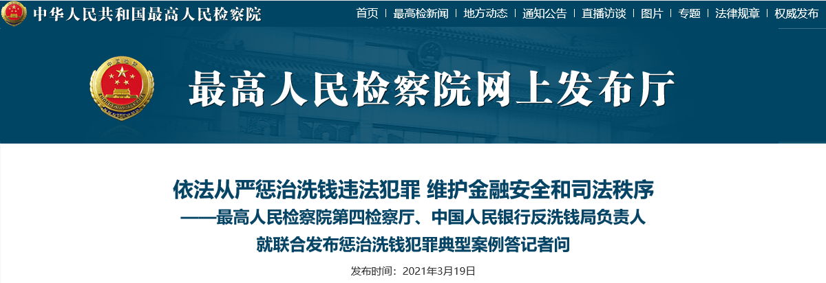 3月19日,最高人民检察院、中国人民银行联合发布6个惩治洗钱犯罪典型案例。这批典型案例覆盖了当前多发、常见的洗钱罪上游犯罪类型,不仅在事实认定、法律适用上对司法办案工作具有指导意义,而且对社会公众具有警示意义。