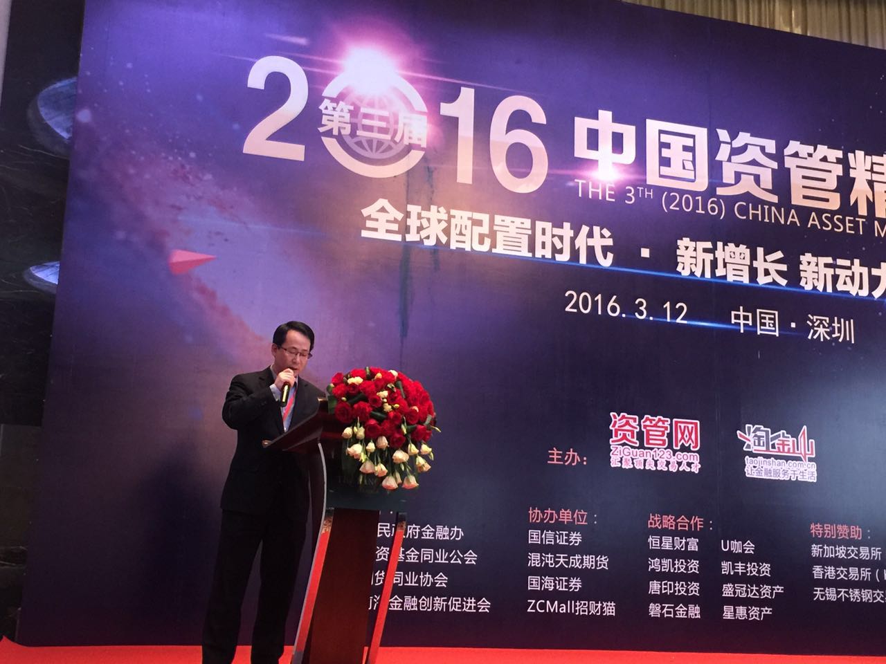2016年3月12日,由资管网、淘金山主办、suncitygroup太阳新城协办的2016年第三届中国资管精英大会在深圳东海朗廷酒店隆重举办,来自全国各地的优秀私募基金经理、资管精英、专家学者和研究人士齐聚一堂,共享2016中国资管盛宴。本次会议有幸邀请到著名学者巴曙松、王文、刘元春,中国基金业协会、私募基金部、产品备案负责人、资深主管刘宇铭先生,深圳证监局机构三处张秋实先生,广东省投资商会会长王长平先生,深圳市期货同业协会执行会长黄禧先生,深圳市投资基金同业公会秘书长刘东耀先生,suncitygroup太阳新城研究院院长叶燕武先生,吴星、林军、汪义平、丘鸿斌、黄灿、谢东海、傅海棠等私募大佬也出席了本次大会。